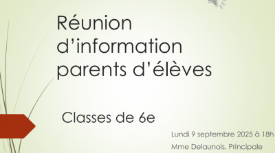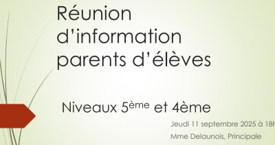 Réunions d’informations Chers parents, retrouvez les ressources des réunions d’informations des différentes classes Article mis en ligne le 17 septembre 2025 dernière modification le 26 septembre 2025 par M. BISSON Réunions d’information Classes de 6ème (cliquez sur l’image) Classes de 5ème et 4ème (cliquez sur l’image) Classes de 3ème (cliquez sur l’image)